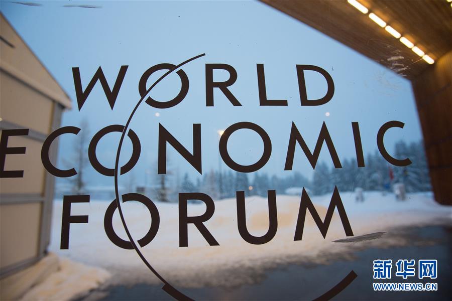 这是2018年1月22日在瑞士达沃斯会议中心拍摄的世界经济论坛的标志。世界经济论坛将“在分化的世界中打造共同命运”定为2018年年会主题。新华社记者 徐金泉 摄