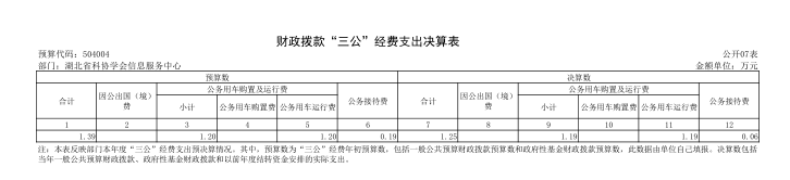 2021年公共预算财政拨款“三公”经费支出年初预算为1.39万元,支出决算为1.25万元,完成预算的89.92%。较年初预算数减少0.14万元,降幅10.07%,决算数小于预算数的原因主要是因为按财政要求压减一般性支出,压减公务接待费0.13万元,公务车运行维护费节约开支0.01万元。无公务出国(境)费用支。