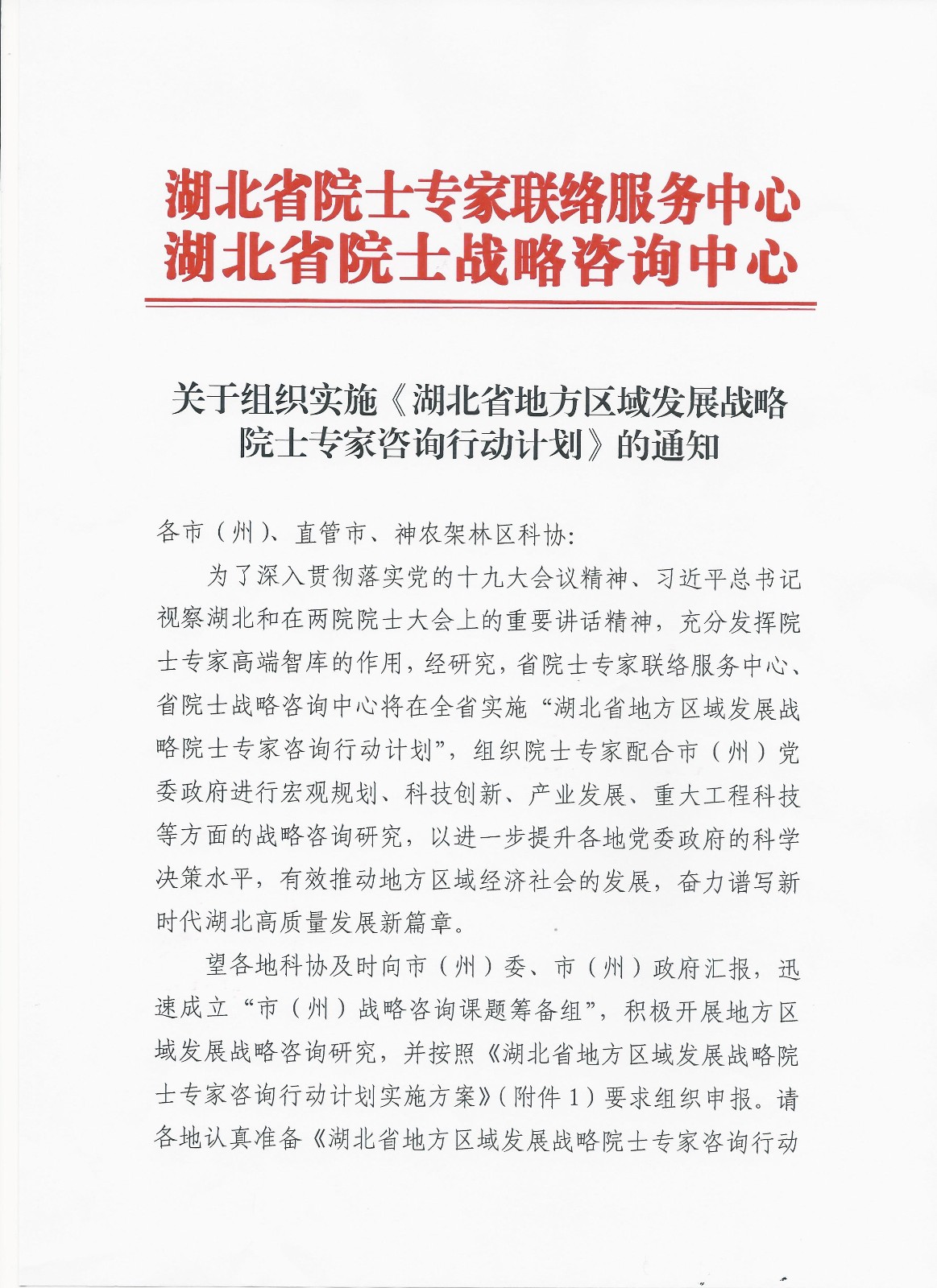 关于组织实施《湖北省地方区域发展战略 院士专家咨询行动计划》的通知