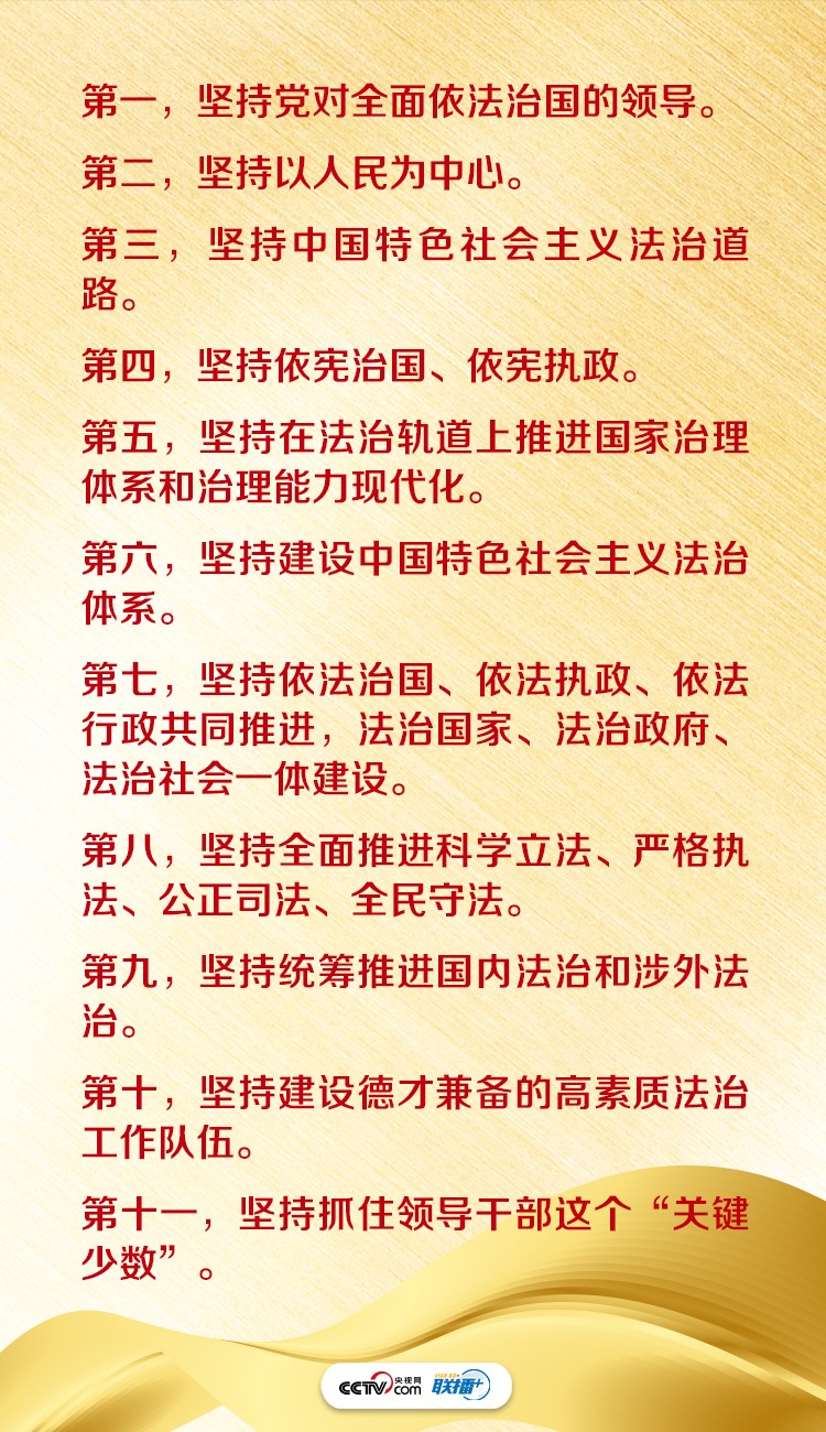 “我们总结中国特色社会主义法治实践规律,传承中华法律文化精华,汲取世界法治文明有益成果,形成了全面依法治国新理念新举措。”此次集体学习,总书记提到了“十一个坚持”。