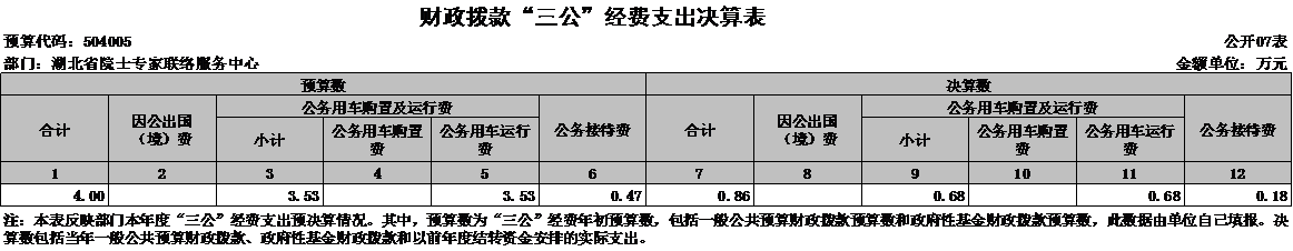 省院士专家联络服务中心2021年“三公”经费财政拨款支出预算为4万元,公共预算财政拨款“三公”经费支出为0.86万元,其中公务接待费0.18万元、公务用车购置及运行维护费0.68万元(其中公务用车购置费0万元、公务用车运行费0.68万元),未发生因公出国(境)费用。