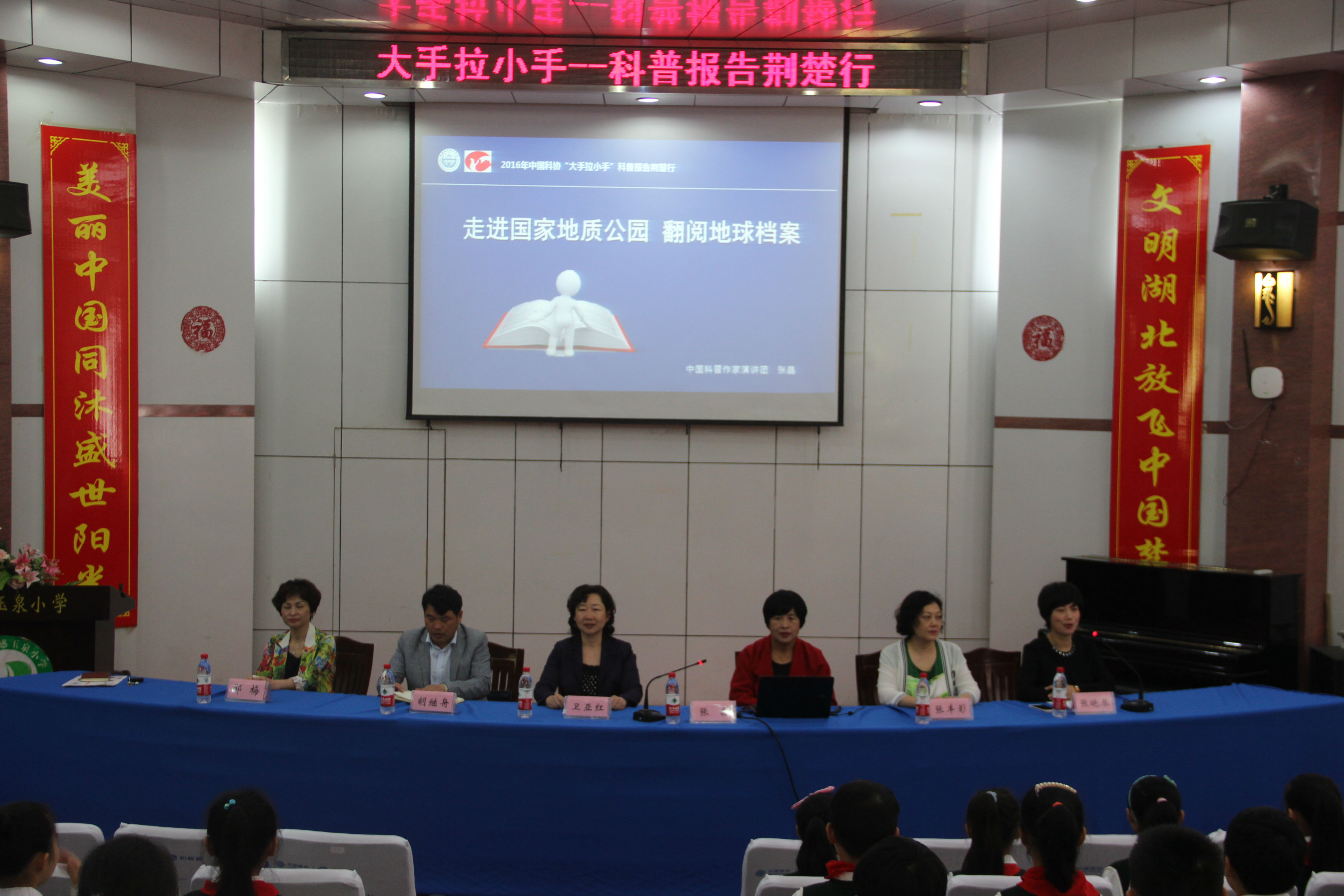 2016年5月16日,由省科协主办、省青少年科技中心承办的“大手拉小手——科普报告荆楚行”活动在孝感市玉泉小学拉开帷幕。此次科普巡回报告为期一周,主办单位专门邀请了中国科普作家协会演讲团的焦国力团长和金声、张晶、刘金霞、杨汝荣、赵育青等6位资深专家,在孝感、潜江的7个县市区,为42所中小学的10000余名师生奉上了一份科普知识的饕餮盛宴。