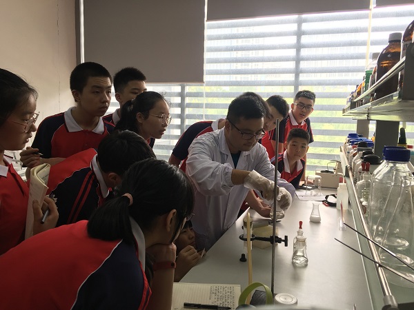 体验完玫瑰扦插后,同学们又在老师的带领下先后参观了果蔬检测中心实验室和玫瑰精油加工提取车间。在实验室里,老师结合植物检测的原理为同学们分别做了蜡烛燃烧实验、发酵粉发酵实验、酸碱滴定实验和二氧化碳提取检测实验。这些小实验中的化学反应让还没开始学习化学的同学们惊叹连连,对即将开设的化学课充满了期待。