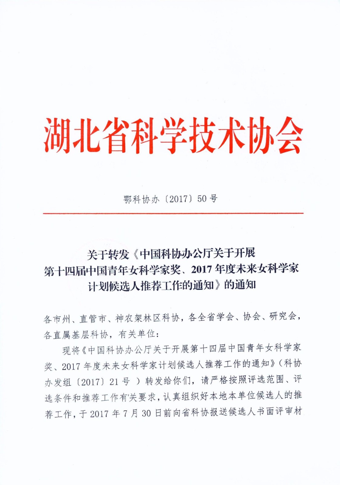 关于转发《中国科协办公厅关于开展第十四届中国青年女科学家奖、2017年度未来女科学家计划候选人推荐工作的通知》的通知