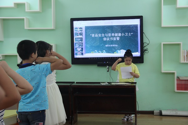 “树立‘健康促进、从我做起’的健康理念,强化‘我营养、我锻炼、我健康、我快乐’的意识,把心动变成行动,形成合理膳食、积极运动、追求健康的校园新风尚…”,这是襄阳市科技馆2019暑期“酷学酷玩”公益课堂“少儿食育课堂”的最后一节课,也是此门课程的毕业典礼,20多位“食品安全与营养健康小达人”们郑重其事地举起右手庄严宣誓,承诺从今天起,合理膳食,运动健康。除了宣誓环节,毕业典礼上孩子们还分组表演了餐桌礼仪情景剧,一起做了“零食拍手歌”的小游戏等等,孩子们都非常珍惜并且舍不得此次难得的相聚。