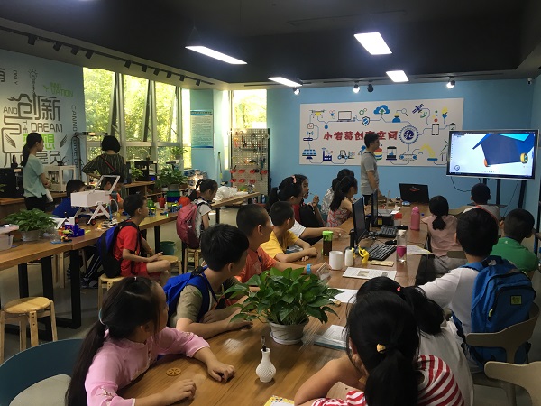 “3D小创客”的结业课上,老师除了点评了孩子们自己设计打印的印章外,还带着小学员们来到了位于诸葛亮中学的“小诸葛创客空间”参观,孩子们对创客空间里打印出来了一个个实物和玩具成品充满了好奇,争先恐后的向老师提问。