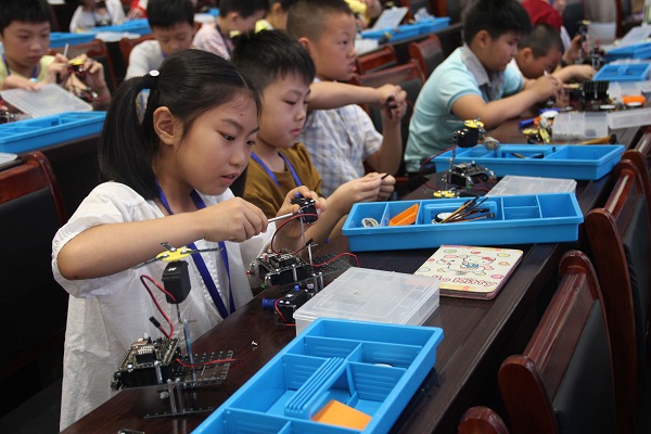 “创意机器人”课程学员们正认真搭建“直升飞机”