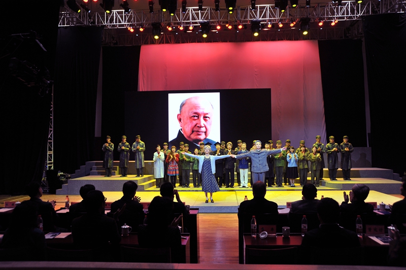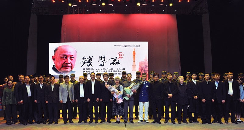 出席话剧《钱学森》首演式的领导嘉宾与全体演职人员合影留念