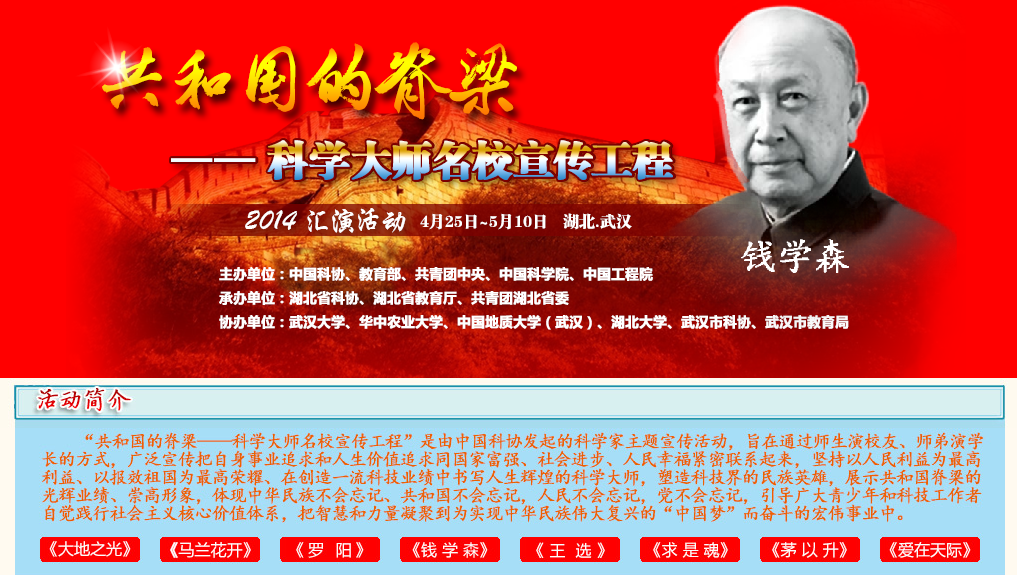 2014年4月25日-5月10日,由湖北省科协等三家单位承办的“共和国的脊梁——中国科协科学大师名校宣传工程”汇演活动在武汉举行,这是首次由地方科协承办的对中国科学家精神的集中宣传,活动取得了圆满成功。中国地质大学(武汉)参加了汇演,参演的剧目是话剧《大地之光》(李四光)。《中央电视台》、《人民日报》、《光明日报》、《湖北电视台》等媒体均作了报道。
