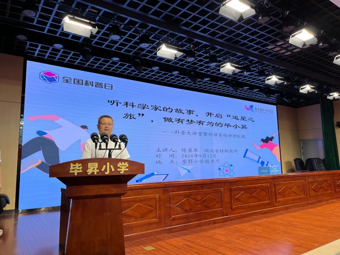 湖北省特级教师陈荣军以《听科学家的故事、开启“追星之旅”,做有梦有为的毕小昇》为题为毕昇小学五年级师生带来一堂生动的科普课。